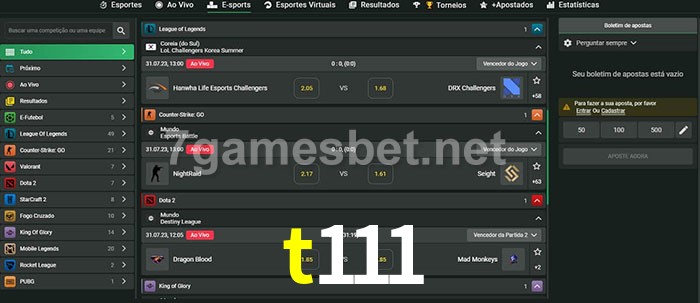 O t111 oferece uma grande seleção de opções de apostas em e-sports com probabilidades competitivas